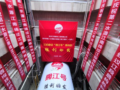 随着始发令的下达,陪同着隆隆的轰鸣声,过江段“拥江号”盾构刀盘徐徐转动,身着红妆的盾构机整体徐徐向前掘进,江南线项目过江段盾构在钱塘江畔顺遂始发,标记着过江段正式进入区间盾构施工阶段,杭州市第二水源输水通道工程建设再次取得重大希望,掀开了工程建设的新篇章。