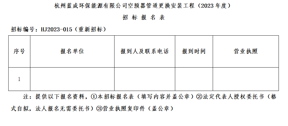 凭证杭州微彩网情形集团招标治理要求,杭州蓝成环保能源有限公司对“空预器管道替换装置工程(2023年度)”举行果真招标。