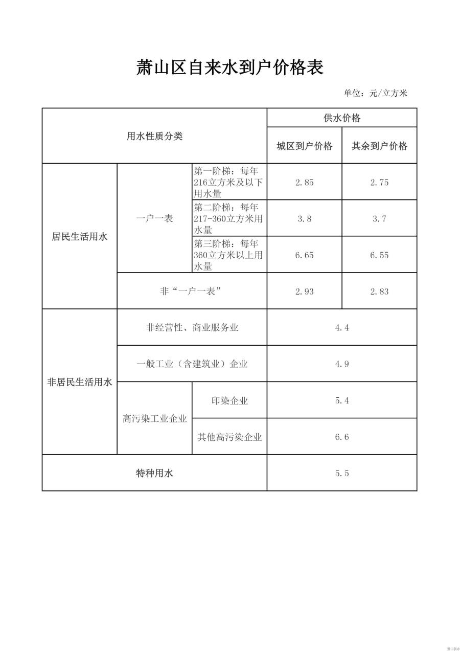 非住民生涯用水:供水价钱凭证萧价【2016】46号文件自2017年1月1日用水时间起执行 ;污水处置惩罚价凭证萧价【2014】46号文件自2014年8月1日排水时间起执行。