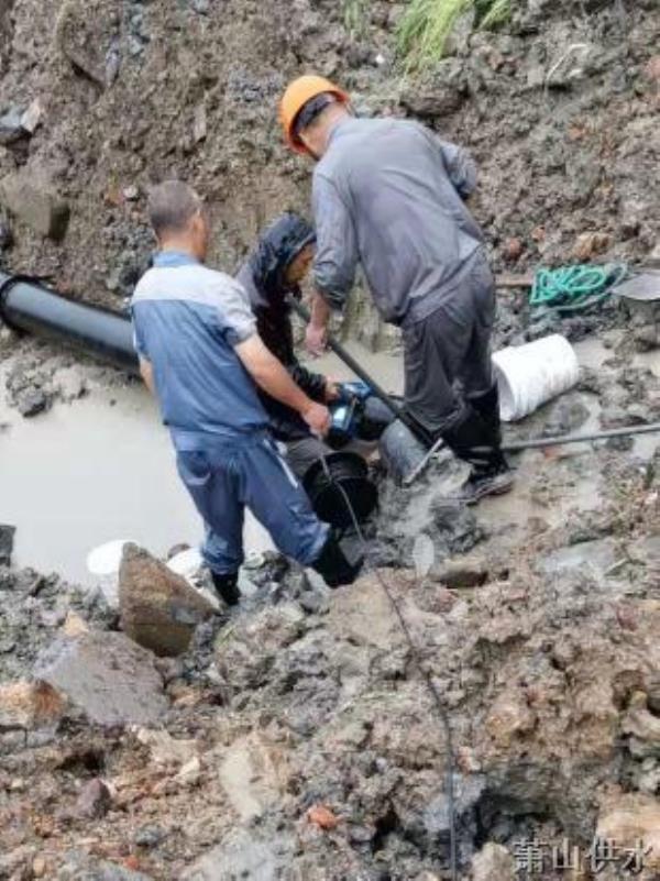 蜀山工业园区一根长达10米的DN 300管被施工挖断,抢修职员第一时间赶赴现场,冒雨开展抢修事情,抢修职员全身湿透,已分不清是雨水、汗水照旧泥水。