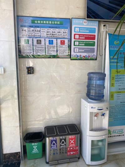 衙前营业所在醒目位置安排了四分垃圾桶,在四个垃圾桶上均贴上了更新后的标识标牌,并在垃圾桶上方悬挂了垃圾分类信息公示栏和垃圾分类周全行动宣传栏,将营业所内的垃圾分类职员信息和垃圾收运单位信息举行了明确公示。