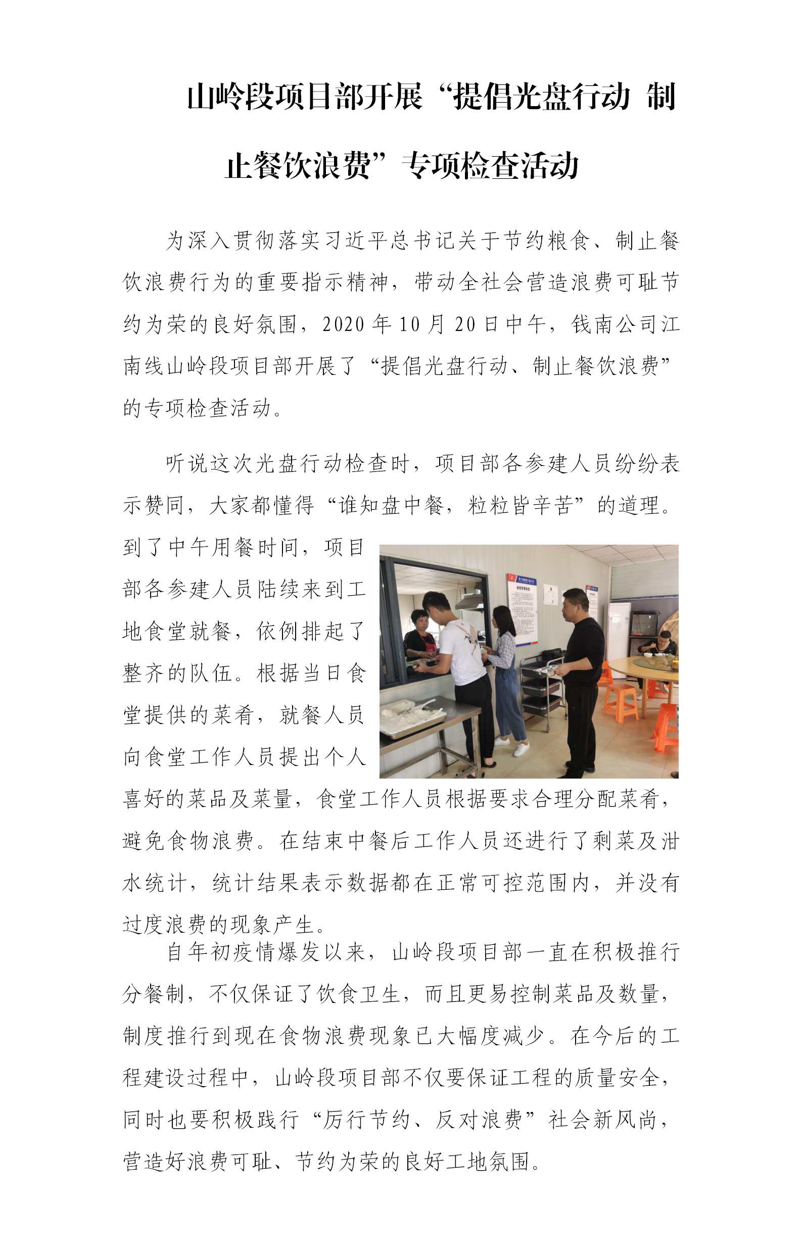 山岭段项目部开展“提倡光盘行动 阻止餐饮铺张”专项检查运动