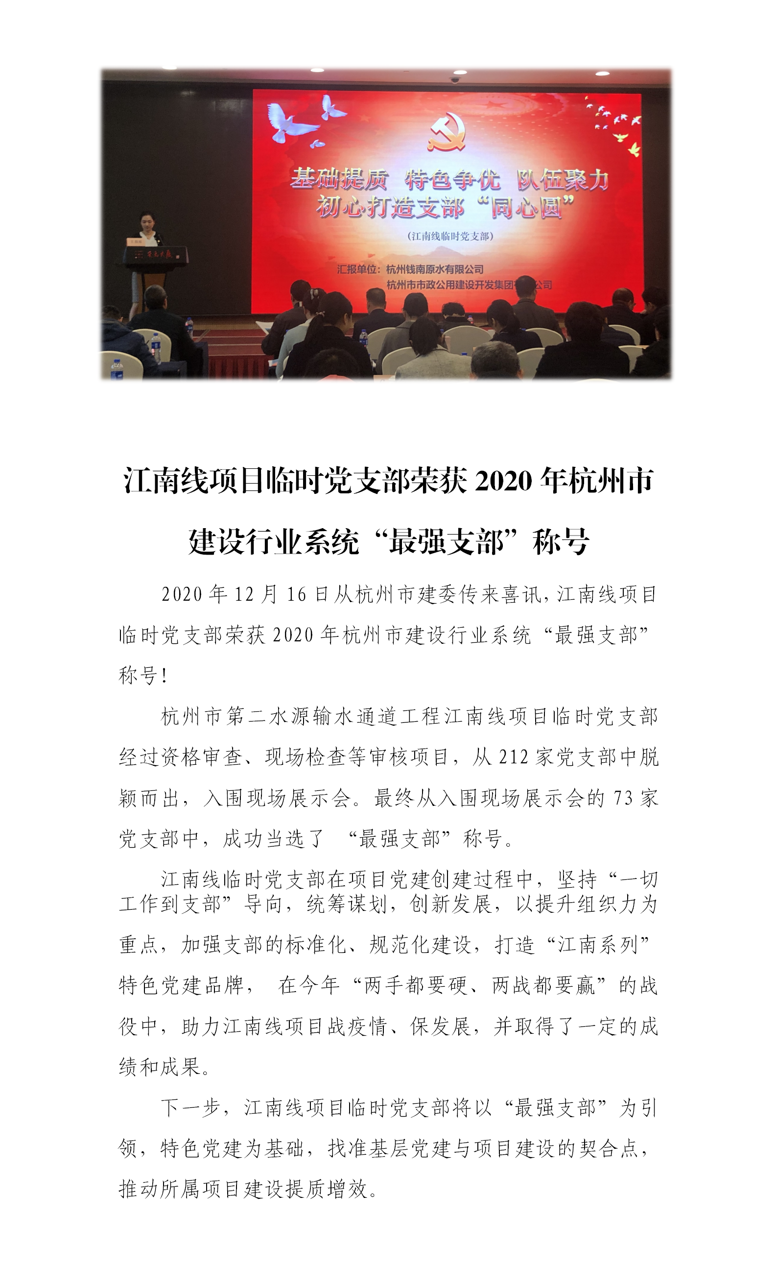 江南线项目暂时党支部荣获2020年杭州市建设行业系统“最强支部”称呼