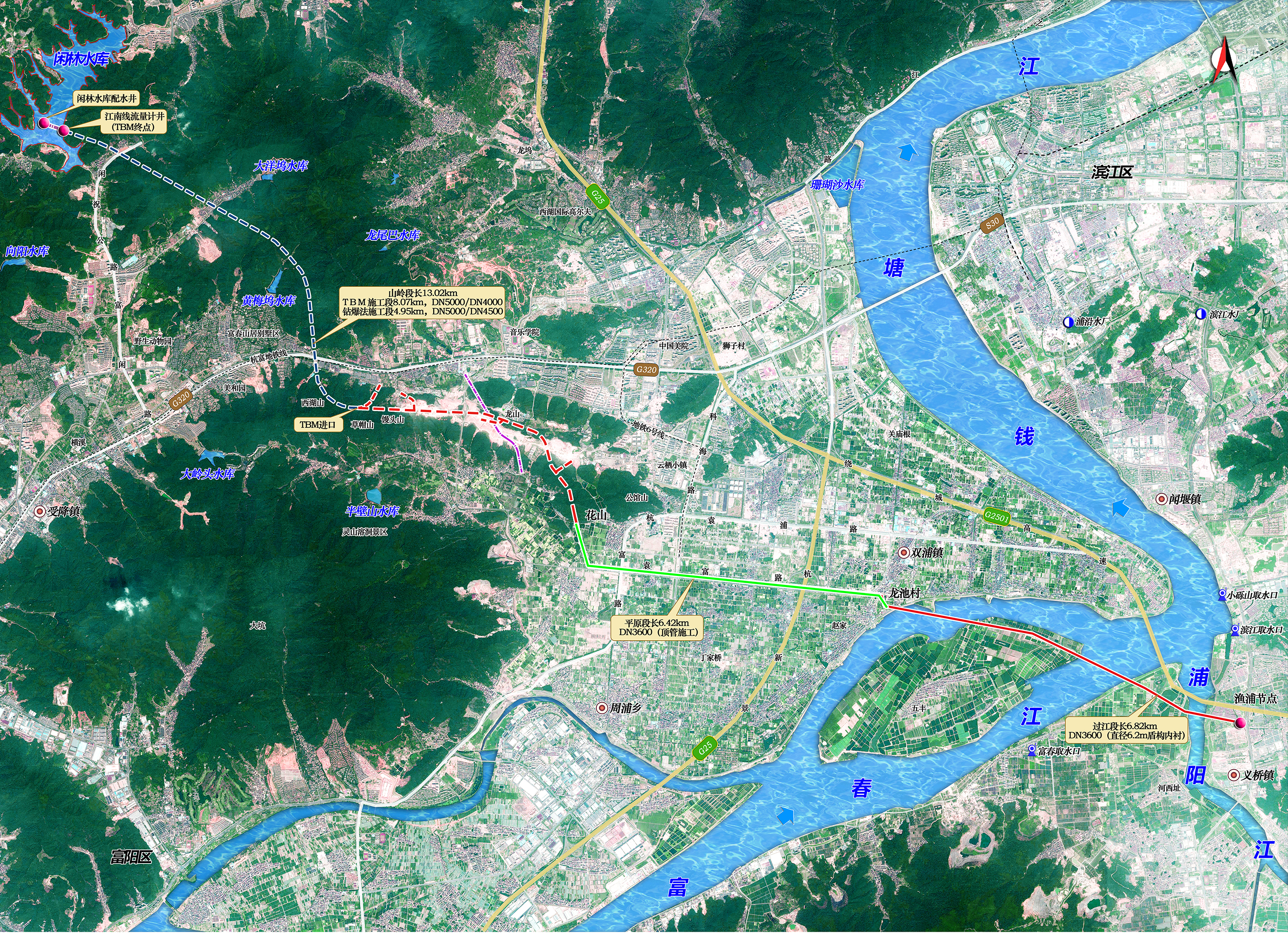 工程自余杭闲林水库配水井最先,新建输水隧洞和管道,途经余杭、西湖、富阳、微彩网四个行政区,最后至微彩网渔浦节点,总长约26公里,总投资约30亿元,全线分3个标段分段开工建设,划分为山岭段、平原段和过江段。