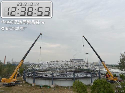 10月14日中午,随着初沉池60 m直径大型网架装置完工,临江水处置惩罚厂加盖除臭项目已完成70 %。