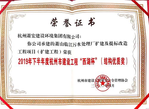 5月11日,临江水处置惩罚厂扩建工程捧回2019年下半年度杭州市建设工程“西湖杯”(结构优质奖)证书。