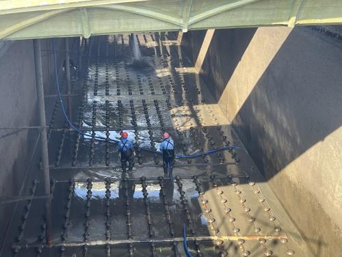钱江厂在包管清静的主要条件下,团结实时天气情形,严密组织、科学调理、平衡施工;全体员工抢生产,保水量,争分夺秒抢夺工期,比原妄想提前14日完成大修,共计替换曝气膜片800余片,替换ABS立柱48根。